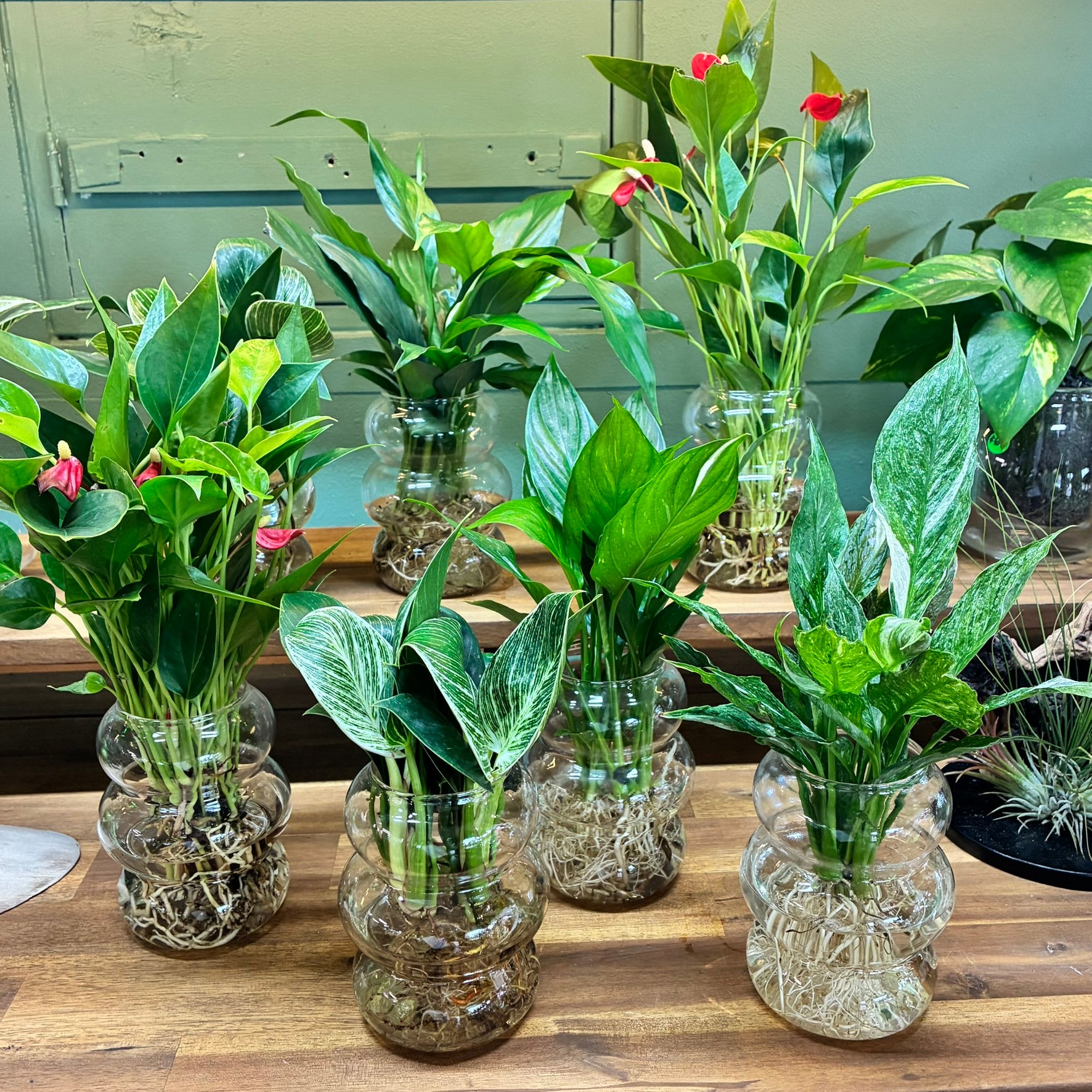Lovely glass vessels paired with a stunning indoor plant.
